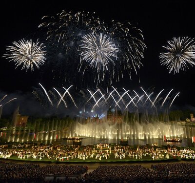 A la nuit tombée vous pourrez assister au spectacle LES NOCES DE FEU : de douces mélodies résonnent sur le lac et réveillent peu à peu le souvenir du plus romantique des mariages. Après s’être rencontrés dans le spectacle « Les Orgues de Feu », la Muse violoniste et le Pianiste virtuose se retrouvent pour célébrer leur amour éternel dans une féerie d’eau et de feu. Assistez à ces noces fantastiques où danseurs et décors géants surgissent des profondeurs du lac, tels des mirages, et reprennent vie pour offrir aux jeunes mariés le rêve d’une fête inoubliable. Retour à l’hôtel et nuit.