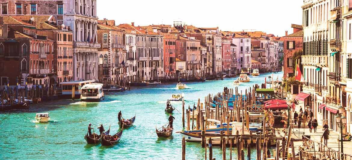 Venise, capitale de la région de la Vénétie au nord de l'Italie, occupe plus de 100 petites îles dans un lagon de la mer Adriatique. La ville ne comprend aucune route, uniquement des canaux, dont le Grand Canal, bordé de palais gothiques et Renaissance. Au centre, la place Saint-Marc abrite la basilique Saint-Marc, recouverte de mosaïques byzantines, et le campanile de Saint-Marc, avec vue sur les toits rouges de Venise.